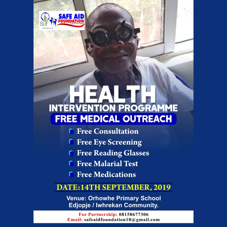 A Non-Governmental Organisation, Safe And Foundation (SAF) is to offer free medical outreach to residents of Edjophe, Iwhrekan Communities in Ughelli South Local Government Area of Delta State on Saturday (14th September, 2019)