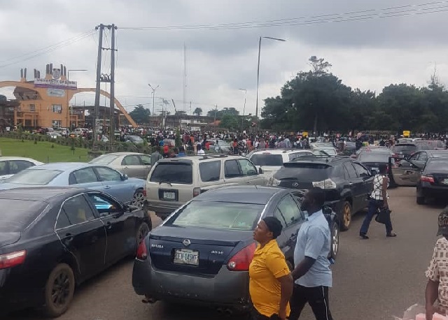 Hundreds of angry students of the University Of Benin (UNIBEN) on Tuesday blocked the main gates of the Ugbowo campus of the institution, protesting alleged incessant charges for late payment of school fee.